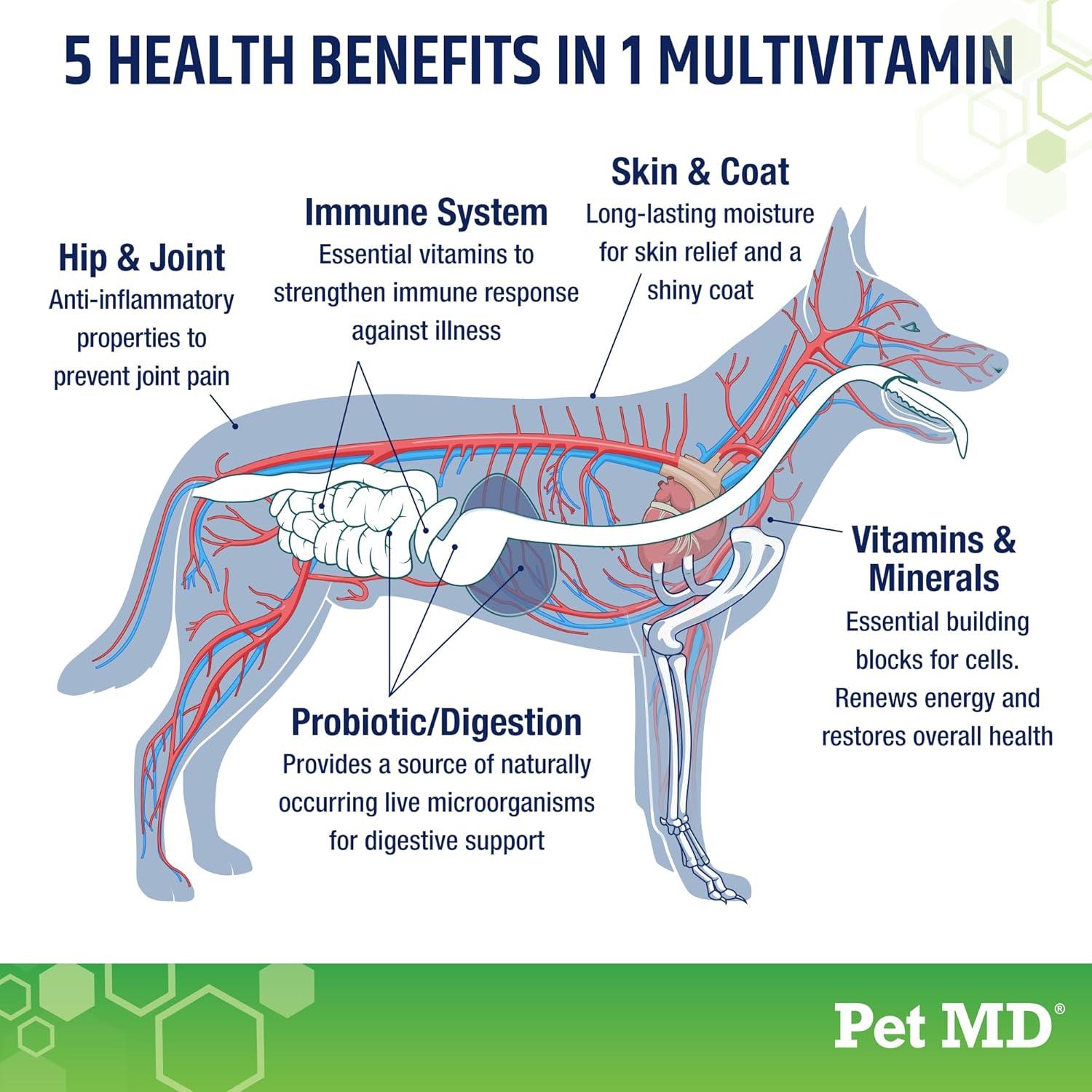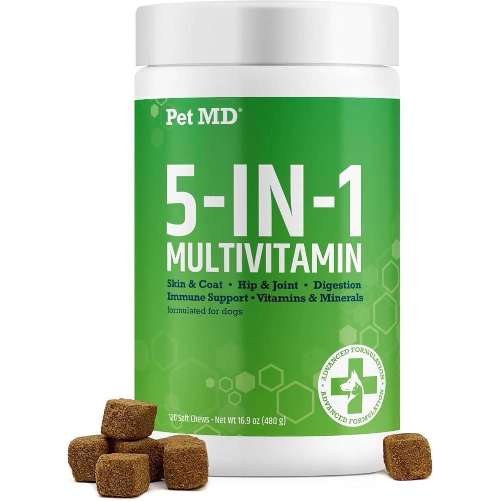 Pet MD 5in1 Dog Multivitamin - 30 Essential Vitamins, Minerals & Nutrients for Skin & Coat, Hip & Joint, Digestion, Immune & Senior Dog Vitamins - Glucosamine, Omega 3 6 9, & Probiotics - 120 ct(60 ct)