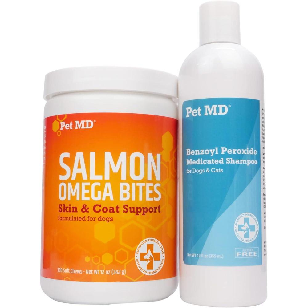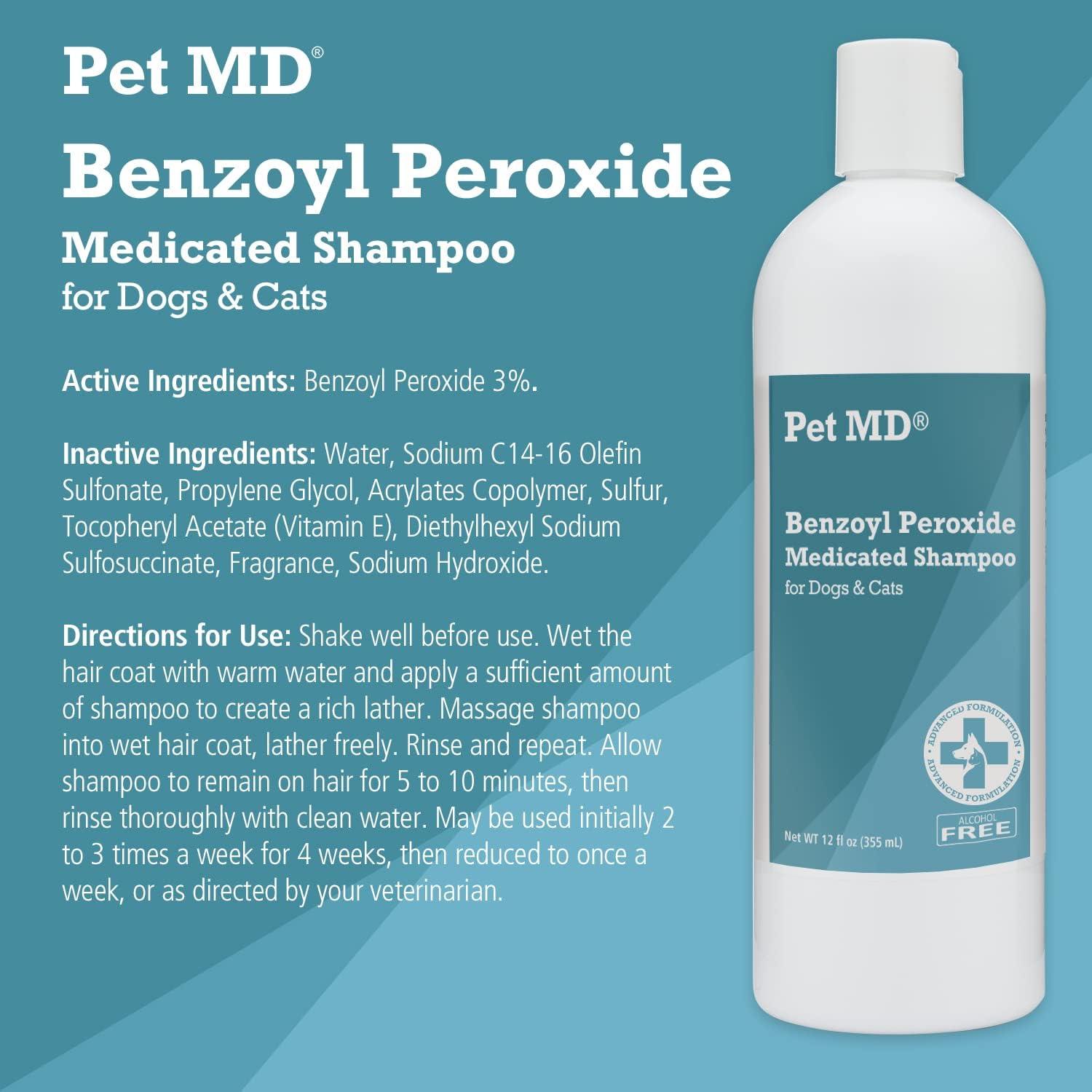 Pet MD Benzoyl Peroxide Shampoo is a powerful cleansing and degreasing shampoo for the relief of scaling and itching associated with skin infection, seborrheic disorders, and follicular plugging on dogs and cats. The combination of benzoyl peroxide, micronized sulfur allows for degreasing, follicular flushing, and enhanced keratolytic and keratoplastic activity. Pet MD Benzoyl Peroxide Shampoo is formulated in a citrus-scented, soap-free, lathering shampoo base with skin moisturizers for gentle cleaning and deodorizing, while effectively removing scales and oils from the coat.
