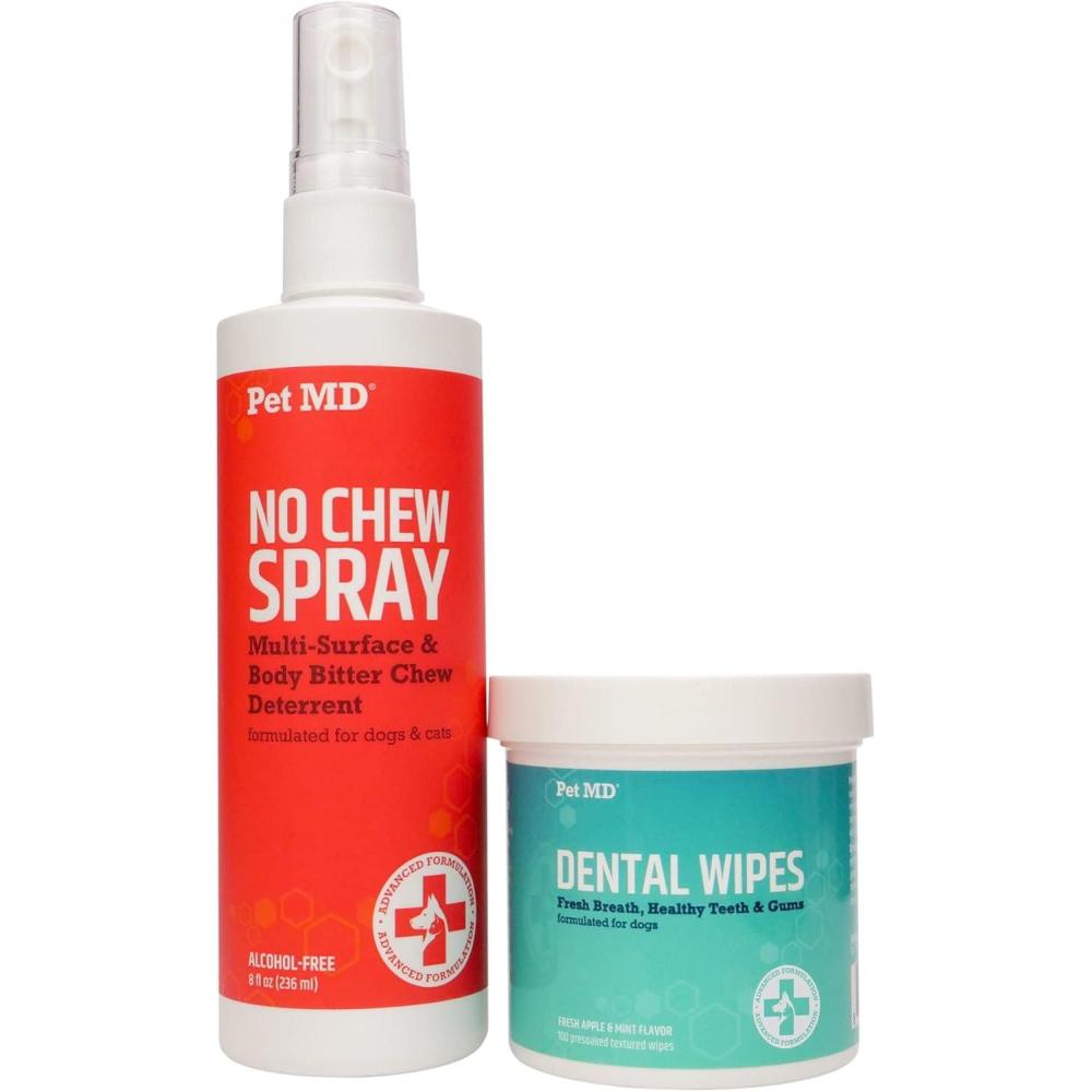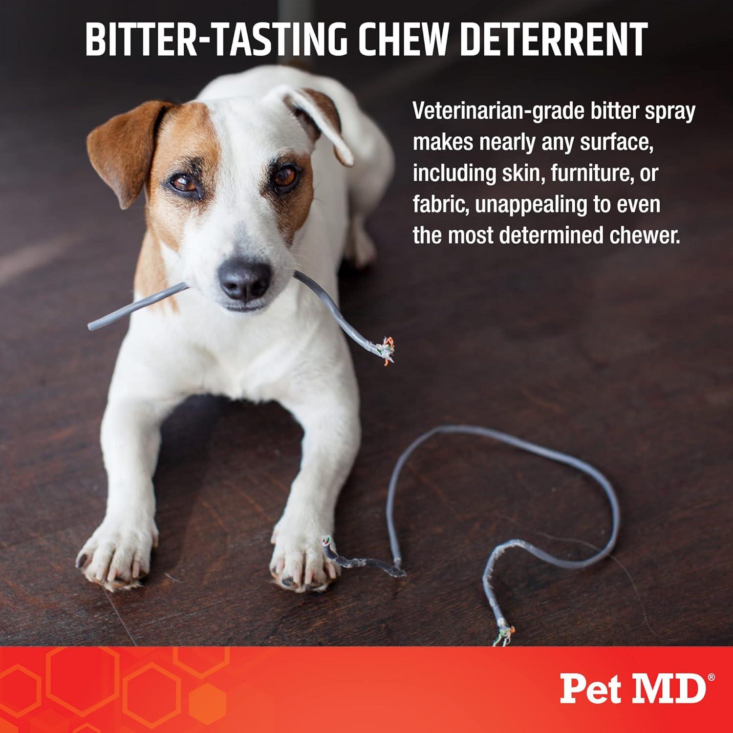 Chewing or licking things they shouldn't is a common occurrence with dogs and cats of all ages. Pet MD No Chew Spray for Dogs and Cats is a gentle bitter spray formulated to help curb unwanted habits by leaving an unpleasant taste on nearly any surface. A simple spray, along with training, can help avert your pet's attention from an object to an appropriate chewing toy. This bitter spray for dogs and cats is alcohol-free, which lasts longer than others as it evaporates slower. The gentle bittering agent is safe to use on many surfaces including plants, wood, furniture, carpet, and drapes. This helps curb pets' habits and divert their attention to their toys; be sure to keep chew toys nearby to show your pet what they should chew on. This cat and dog no chew spray may also be used on the skin such as over topical medications, over bandages, or on itchy patches. As an effective no-bite spray for puppies, this spray is also great for teething dogs, who may bite on objects to self-soothe. For an effective chewing deterrent made with gentle ingredients, reach for Pet MD No Chew Spray.