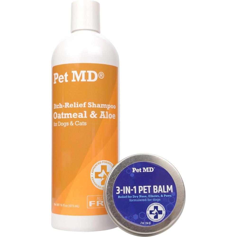 Pet MD Oatmeal & Aloe Shampoo is a soap-free formulation with nourishing emollients and aloe vera to soothe and cleanse the skin. This itch-relief formula contains hydrolyzed oat protein, a superior form of oatmeal for skin health, which draws in moisture to rehydrate dry skin.