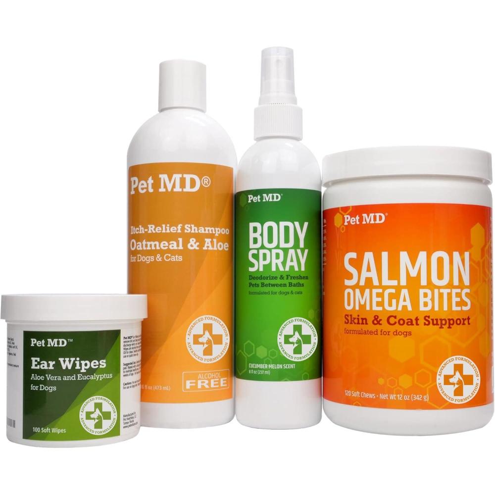 Pet MD Oatmeal & Aloe Shampoo is a soap-free formulation with nourishing emollients and aloe vera to soothe and cleanse the skin. This itch-relief formula contains hydrolyzed oat protein, a superior form of oatmeal for skin health, which draws in moisture to rehydrate dry skin.