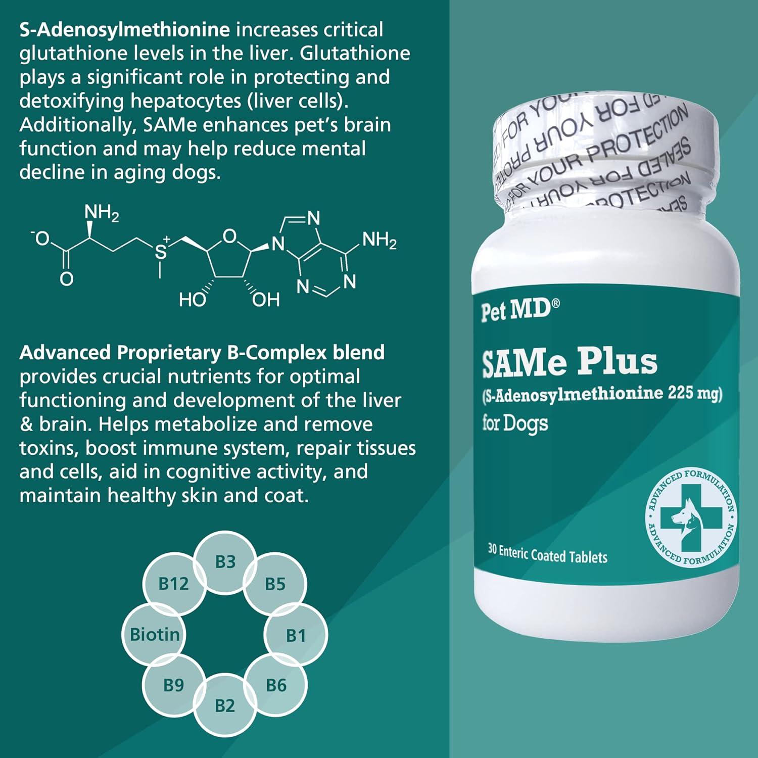 Protect Against Liver and Cognitive Damage: Pet MD S-Adenosylmethionine (SAMe) is recommended for dog's liver support, and is formulated with amino acids, B Vitamins, B6, Zinc and more.