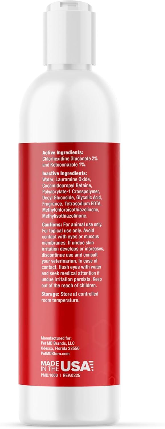 Pet MD's Topical Shampoo gently cleanses the skin and coat.